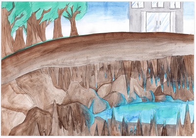 地盤をぼうしにたとえて、それをしっかり手と 私たちが住んでいる土地の下にもこんな風に鍾乳洞が広がって