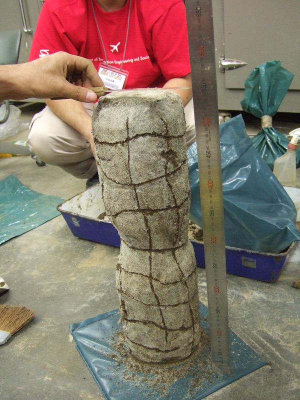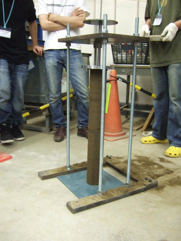 当初は,想定外の試料分量に試料配合割合や含水比調整に苦労するチームも見受けられたが,いずれの参加チームも事前のトレーニングを重ねており,最終的には立派にタワーを作り上げていた.また,新聞紙の使用方法にも各チームで工夫が見られ,土と混合して補強剤としたり,綺麗に細工してデコレーションとしたり,プレゼンテーションの演出に用いたりと非常にユニークであり,思いもよらぬ新聞紙の使いように審査員の方々も驚かれていたようである.
