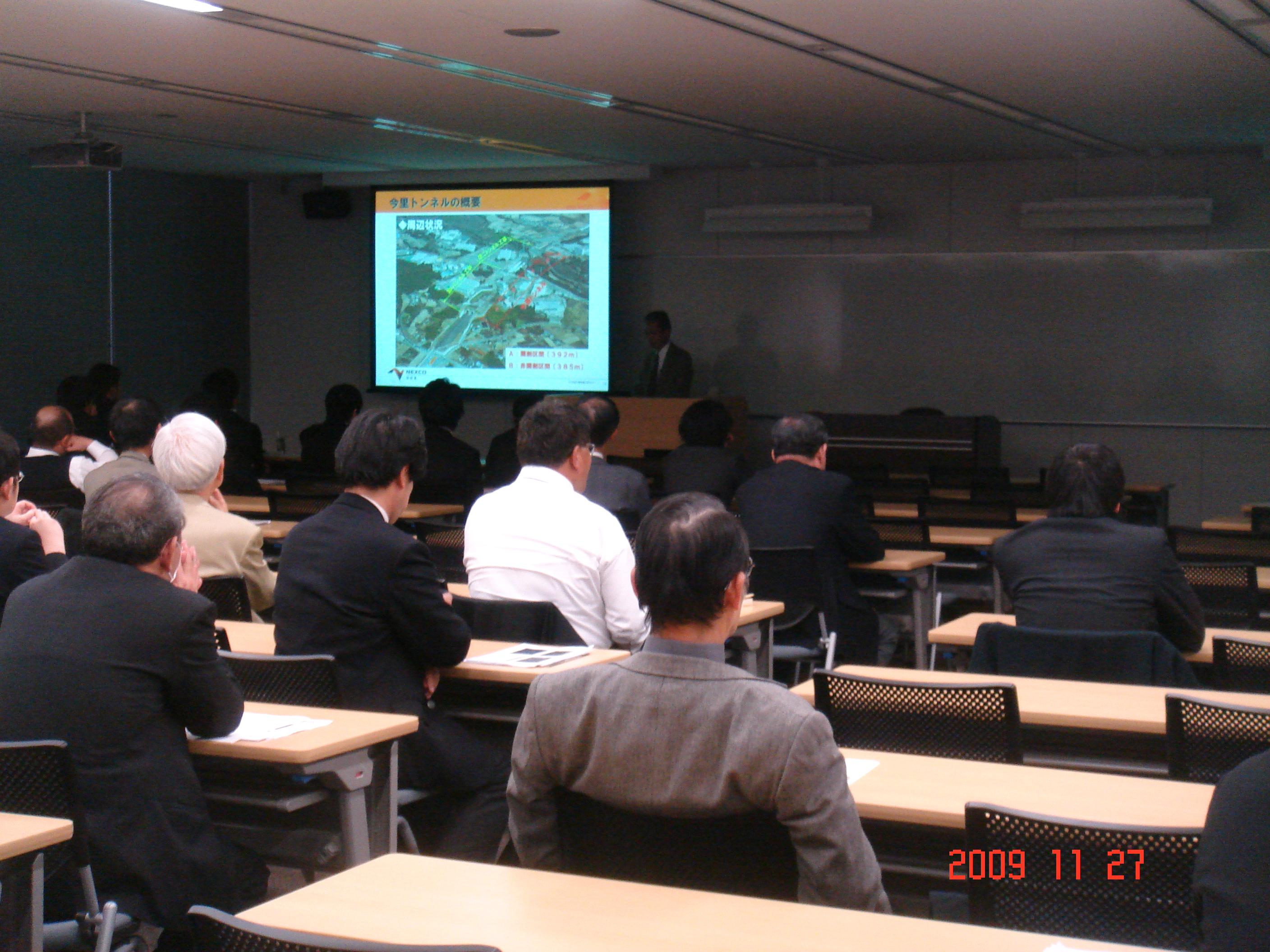 第3講演には進行中のプロジェクトとして中日本高速道路竃シ井乃氏をお迎えし、新東名高速道路今里第一トンネルの実際の施工時の状況写真等を交えて、様々な問題に対しいかに対応し、竣工に及んだかをご講演頂きました。