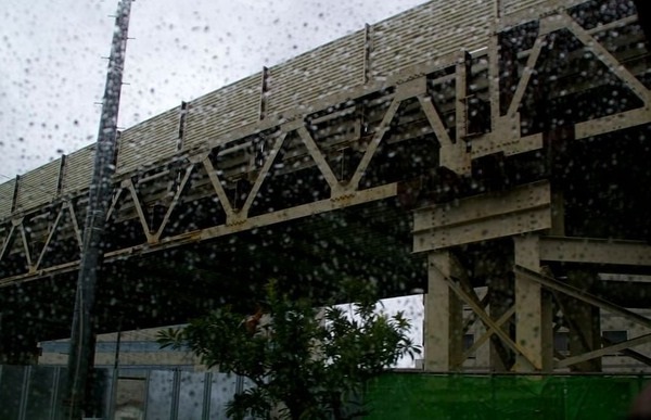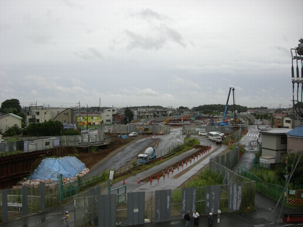 ①京葉JCT工事地区では、残念ながら雨の影響で工事地区を見てまわることはできませんでした。当地区は、市街地であり、かつ複雑な地下構造となるため、難工事となることが予想されています。現地には工事による渋滞発生をさけるため、仮設の工事用道路ができていました。