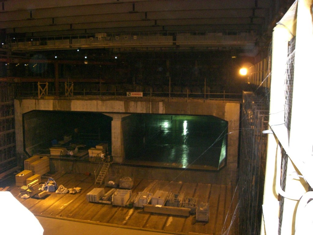 ③小塚山トンネル工事地区は、小塚山の自然をまもるために土被りの薄い条件での工事で、パイプルーフ工法が採用されています。本線は開通し、現在は側道を施工中です。また、周辺住民からの要望・配慮により工事現場を建屋構造とし、透明の囲い板を採用しています。