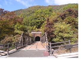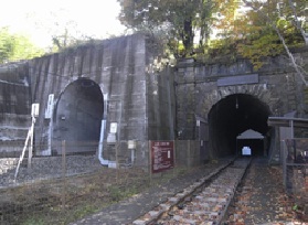 写真3 大日影トンネル(勝沼口) 右側が遊歩道、左側は現在の中央線 |