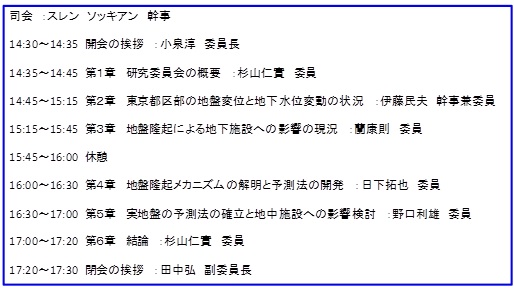 平成22年4月に,地盤工学会関東支部に設置した「地下水位の回復にともなう広域地盤隆起の問題とその地中施設への影響に関する研究委員会」(委員長 : 小泉淳早稲田大学教授)には,31名の委員と2名のオブサーバーが参加して活動した。