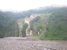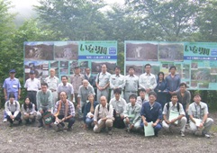 | 写真1:参加者の集合写真 | 写真2:稲荷川上流の山腹工現場 |