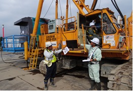 講習会終了後は現場にて、施工会社である河本工業㈱の福地所長様から、工事内容と施工状況について説明していただきました。現地の地盤には転石が混入しており、転石の粒径によって工法も選定していることを聞き、設計・計画段階での現地地盤調査の重要性も改めて実感しました。