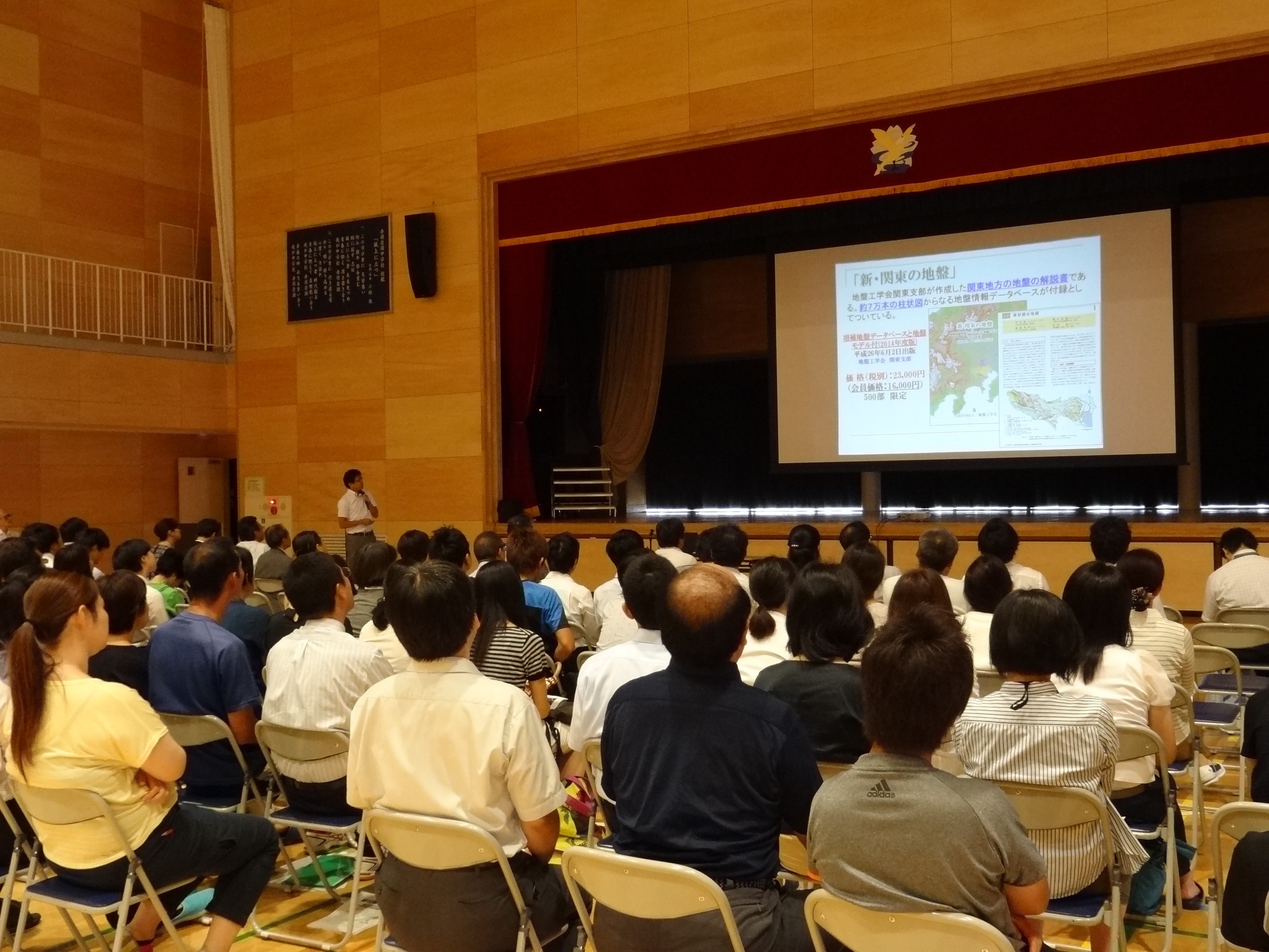 2015年8月27日、赤羽岩淵中学校(東京都北区)にて龍岡文夫先生(東京理科大学)と王寺秀介氏(中央開発株式会社)を講師とした防災講演会が開催されました。この催しは、赤羽岩淵地区で連携している5つの小中学校が、教員と保護者を対象に毎年開催しているものです。地盤工学会には、2012年に出前授業を行った王子小学校の元校長先生を介して依頼がありました。参加者は約100名です。地盤工学会からは、龍岡先生と王寺さん、事務局の青木美智子さん、和田の4名が参加しました。