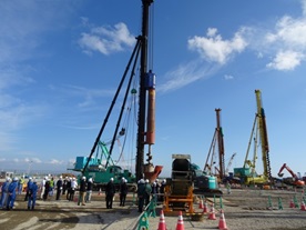 南本牧廃棄物最終処分場では,現在埋め立て部分を高密度化することで,処分容量の増大と処分場の延命化を図るための工事が進められています。今回見学させていただいた廃棄物静的圧縮減容化工法(リフューズプレス工法)は,パイルドライバーに特殊なオーガー(貫入体スクリュー)を装着させ,正転で廃棄物層を掘削しながら現地盤を横方向に圧縮し,所定の深度まで到達させた後,空いた孔に廃棄物(焼却灰)をバックホー及びコンベアユニットにて投入し,オーガーを反転して廃棄物を孔内で締固めながら引き抜くことにより,新たな埋め立て容量を生み出すものです。本工事により,3年間の処分場延命化が図られるとのことです。