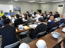 事業の概要から工法の詳細まで,ご担当者からご説明いただきました。現場では施工機の間近で,貫入から廃棄物の投入・引抜きまで一連の作業を,丁寧な説明を交えて見せていただき,特殊な施工内容を理解することができました。また,廃棄物のストックヤードでは,主灰,飛灰,下水汚泥焼却灰の3種類の特性の違いや,工事に際しての留意点および工夫などについても教えていただきました。見学後,会議室に移動しての質疑応答では,参加者から多くの質問が挙げられ,処分場の延命化への関心の高さと環境面での重要さを実感しました。