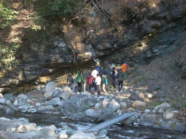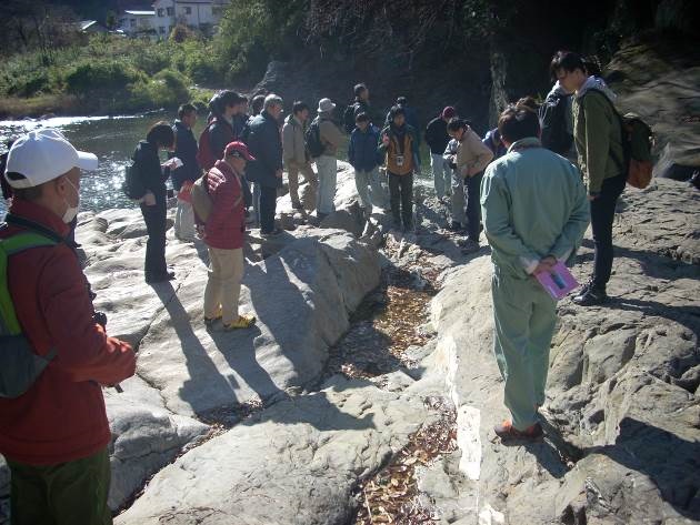 冬晴れの下,前橋市の群馬建設会館を出発し,参加者29名は下仁田自然史館に向かいました.館内のビデオとパンフレットでジオパークの概要説明を受けた後,二斑に分かれて,跡倉クリッペのすべり(断層)面観察と館内展示物の見学を行いました.前者は,白亜紀後期の跡倉層が三波川帯の緑色片岩の上に乗り上げている所で,跡倉クリッペの下面にあたります.また後者には,下仁田周辺の岩石や自然,名産の蒟蒻などに関する資料が展示されています.