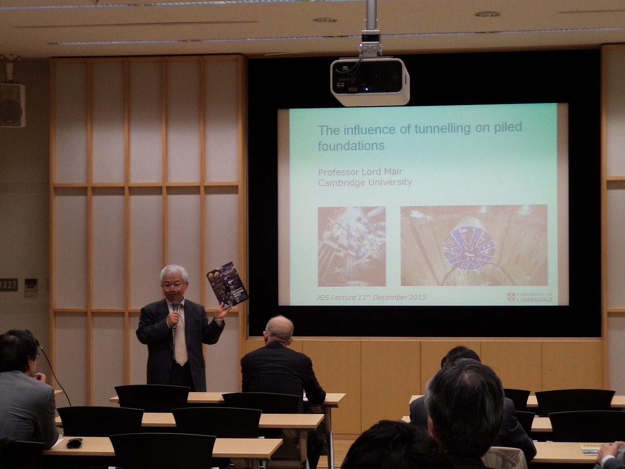 平成27年12月11日(金)17:00~18:45,地盤工学会(JGS会館)地下大会議室において,英国ケンブリッジ大学土木工学科長Robert Mair教授をお招きしまして,国際講演会「The Influence of Tunnelling on Piled Foundations」を,地盤工学会関東支部企画総務グループ主催で開催しました.さらに本講演会では,Mair教授と古くからのご友人でもある,茨城工業高等専門学校(元地盤工学会会長)日下部校長をお招きいたしました.講演会のプログラムとしては,17:00に講演会の開会し,冒頭に日下部先生からMair教授の経歴についてご紹介を頂いた後,Mair教授より1時間ほどご講演頂き,さらに日下部先生より20分ほどご講演を頂きました.本講演会には地盤工学会関東支部メーリングリストによる広報などを通じまして,合計28名の方々にご参加頂きました.