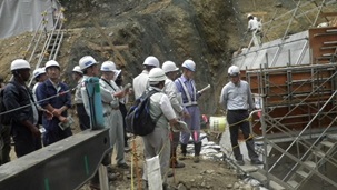 当日は道の駅「湯の香しおばら」に集合し,車4台に分乗し見学に向かいました。芹沢地区では日光砂防事務所 秋元様より,地区内8渓流9箇所において同時多発的に土石流が発生した被災状況,既整備済みであった砂防堰堤の土砂捕捉状況,被災後の迅速な応急復旧作業状況,警戒監視体制,砂防堰堤工事状況などをご説明頂き,実際の堰堤工事現場の見学をしました(写真-1,写真-2参照)。
