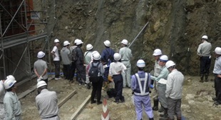 続いて那須塩原市上塩原地区の地すべり現場を見学しました。栃木県大田原土木事務所整備部奈良場様より被災状況,調査状況,復旧対策計画などをご説明頂き,地質調査において採取されたボーリングコアを観察させて頂きました(写真-3,写真-4参照)。