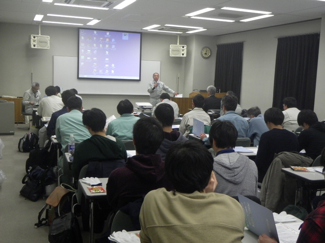 今回の現場見学会では、理解を深めるため事前に座学を実施し、上信自動車道の概要と地盤改良工法(深層混合処理工法)の施工技術(設計・施工管理・品質管理)について説明していただきました。