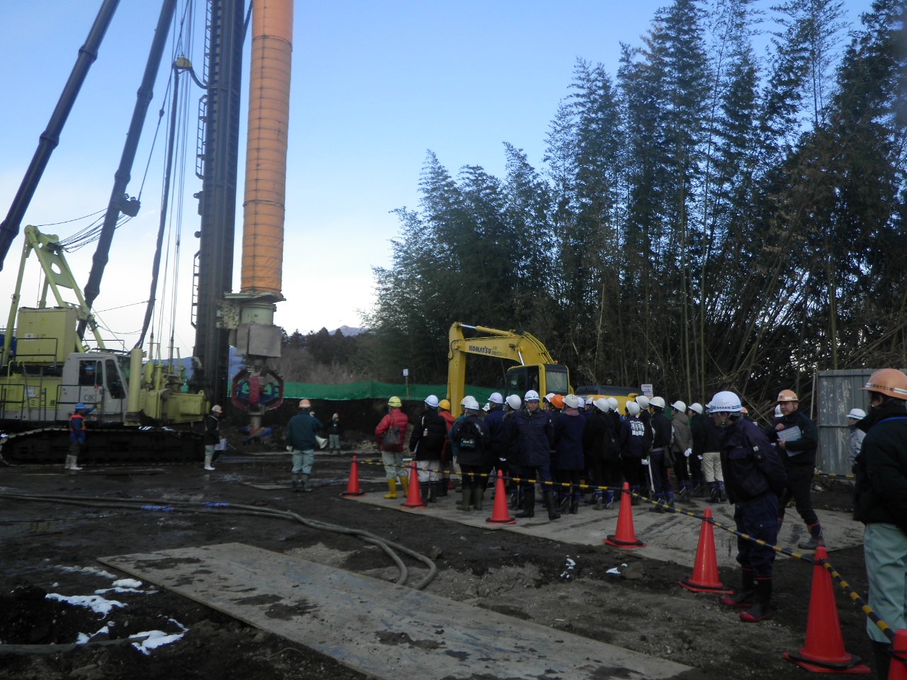 地盤工学会関東支部群馬県グループは、平成30年1月23日(火)に群馬県が施工する上信自動車道金井バイパス工区で地盤改良工事の現場見学会を開催しました。前日の関東地方は厳しい寒波と大雪に見舞われましたが、当日は穏やかな天気となり県内外から産学官合わせて34名の参加がありました。