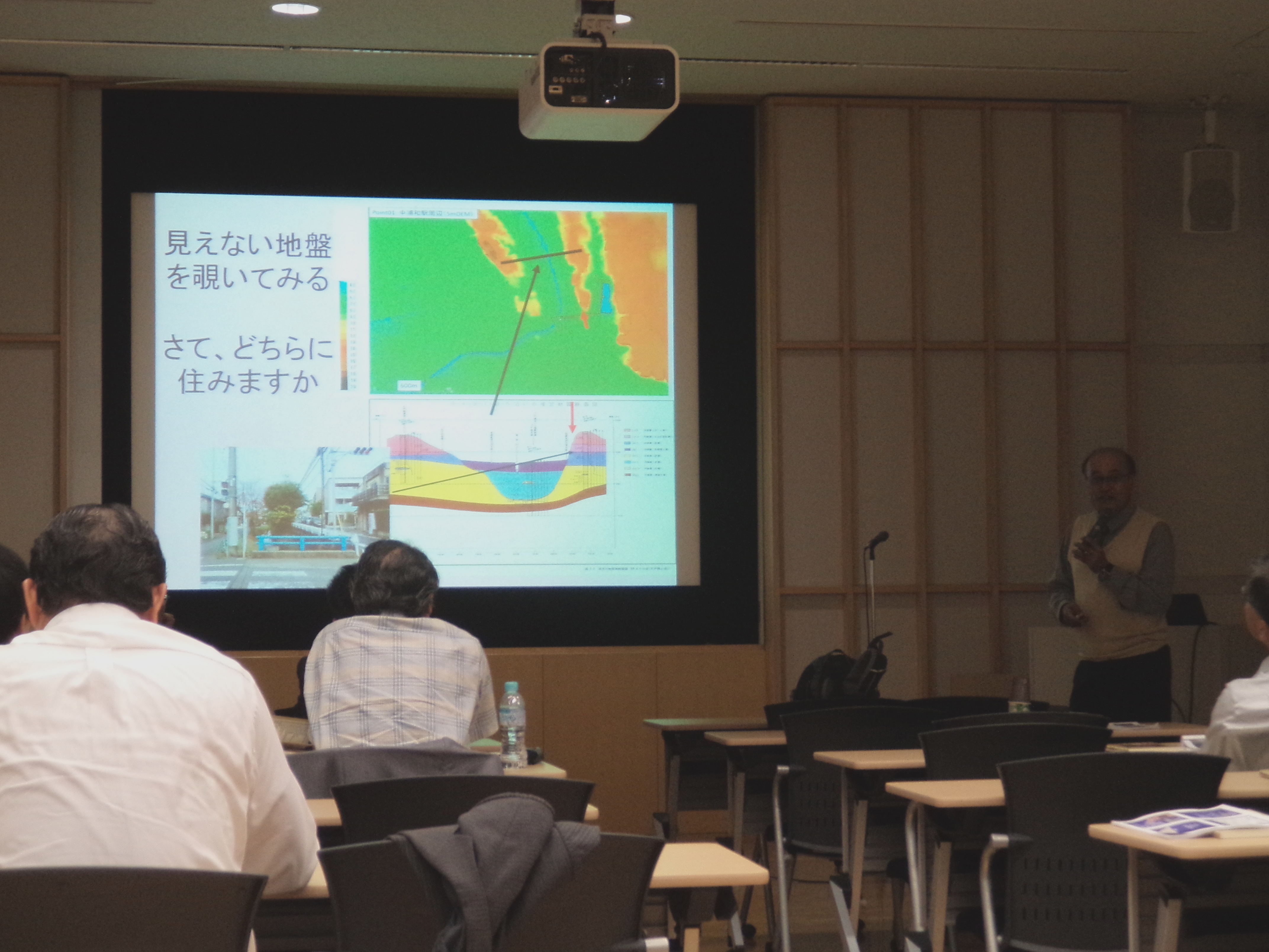 (2-1) 事例紹介1「表面波探査による地盤情報の見える化」五洋建設株式会社技術研究所 上野 一彦氏: かけやなどで地盤をたたいて発生させた表面波の伝播を活用して,海底の地盤中の速度分布を推定し,そこから地盤の硬軟を推定する方法について説明が行われました.海底の表面波測定に海底面に這わせた間隙水圧計を用いることが斬新に思いました.この手法の適用範囲について会場から質問が出てきました(写真-3).