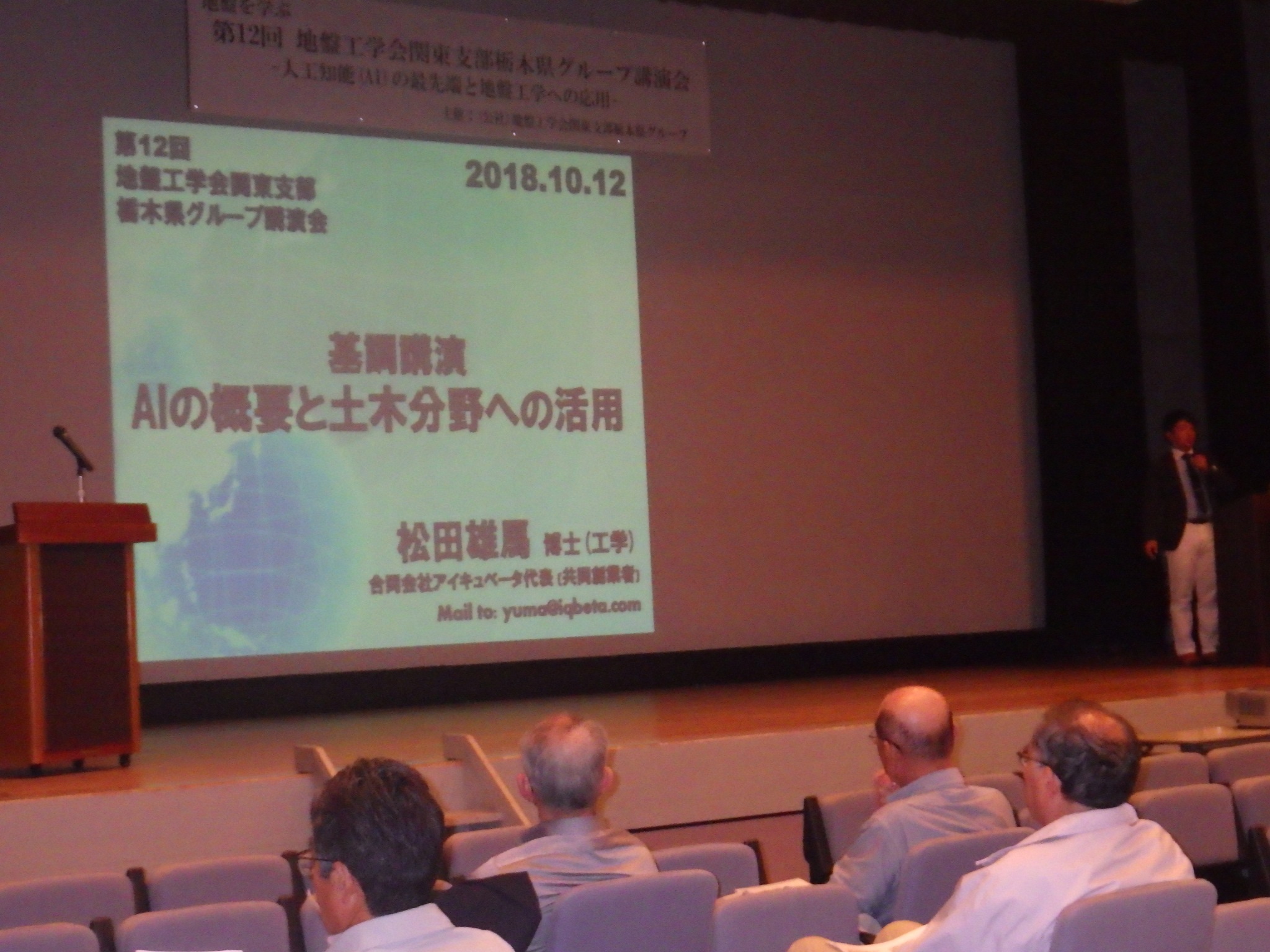 平成30年度の地盤工学会関東支部栃木県グループ主催の講演会は「人工知能(AI)の最先端と地盤工学への応用」と題して,10月12日に宇都宮市東活動センターの大ホールで開催されました.現在,国土交通省の主導で,i-constructionやCIMなど,3次元計測したデータを用いた維持管理の実用化が進められていますが,その先には,人工知能(AI)の活用も期待されます.そこで今回共催を宇都宮市建設技術協会,公益社団法人 土木学会関東支部栃木会,一般社団法人 栃木県地質調査業協会に,また後援を公益財団法人 とちぎ建設技術センター,一社社団法人 栃木県建設業協会及び栃木県土木施工管理技士会に賜り開催いたしました.参加者数は56名でした.