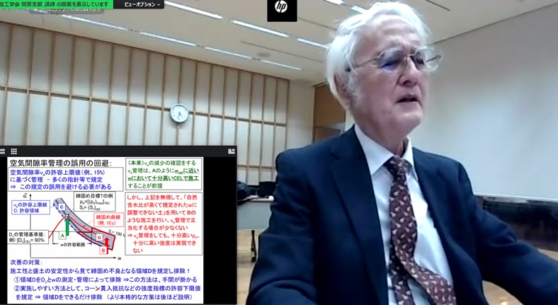 地盤工学会関東支部では、例年、関東支部総会に合わせて特別講演会を実施している。令和3年度特別講演会「土の締固め-古い課題の新たな展開-」は、コロナ禍の中、龍岡文夫先生を講師として令和4年4月25日午後4時15分~午後5時45分まで、地盤工学会会館地階大会議室よりZoomウェビナーを用いたオンライン配信の講演会として実施した。