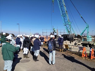 見学会の前半は、右岸側でA1橋台下部工掘削工事の様子を見学した。乙女大橋の橋台と橋脚は、地表から支持層までの深度が深いため、全周回転式オールケーシング工法を用いた場所打ち杭の工事が行われている。A1橋台における鋼製ケーシングチューブの長さは43m、直径は1.5mで、場所打ち杭の本数は9本とのことであった。見学時は、その内1本の掘削工事の開始直前で、現場には全周回転掘削機や100トンクローラークレーンが所定の位置に配置されており、ケーシングチューブ内部の土砂を排出するためのハンマーグラブも間近に見ることができた(写真-1)。参加者は、普段なかなか目にすることのない下部工掘削工事について、説明を興味深く聞いている様子であった。