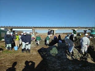 後半は、先に行われた同じA1橋台の場所打ち杭から排出された掘削土の置き場へ移動した。ここでは、河野から関東平野の地下地質の概要について説明を行った他、既に判明している乙女大橋付近の地下地質の特徴(深度15m前後と深度50m前後に貝化石の含有層が存在すること、深度26m付近にN値が急激に高くなる層準が認められることなど)の説明を行った。そして、これらの特徴から、栃木県内では地表露出が見られない約12万5千年前(MIS5e)の下総層群木下層と約24万年前(MIS7)の下総層群清川層に対比される可能性が高く、N値が急激に高くなる層準が両者の境界に当たると解釈されることを説明した。説明の後は、堆積物の観察や掘削土に多数含まれている貝化石の採集を行った(写真-2)。掘削深度から見て、今回の貝化石はすべて木下層産と判断される。主な産出化石は、二枚貝はマガキ、ハマグリ、サルボウガイ、マテガイ類、ハイガイなど、巻貝はアカニシ、バイガイ、ツメタガイ、イボウミニナなどであった。参加者は、童心に返ったように化石探しに熱中しており、ある参加者は大きさ10cm以上もある立派なアカニシを採集できて喜んでいた。また、見本として用意しておいた分類済みの本地点産の貝化石と比較し、その種類をメモしていく参加者もいた