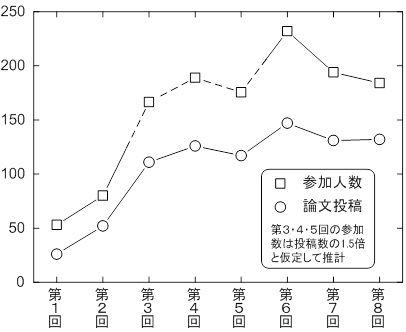 図1.関東支部発表会の参加人数と論文投稿数の推移 |