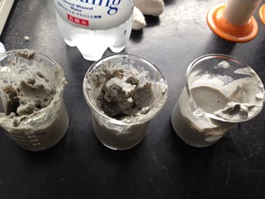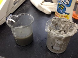 まず,「実験」ではベントナイトが溶液と反応すると膨潤するが,ベントナイトと溶液の組合せを変え,どの組み合わせが最も膨潤するかを競い合った(チーム対抗戦).ベントナイトは2種類,溶液は5種類用意した.