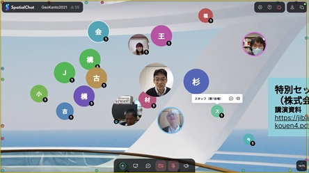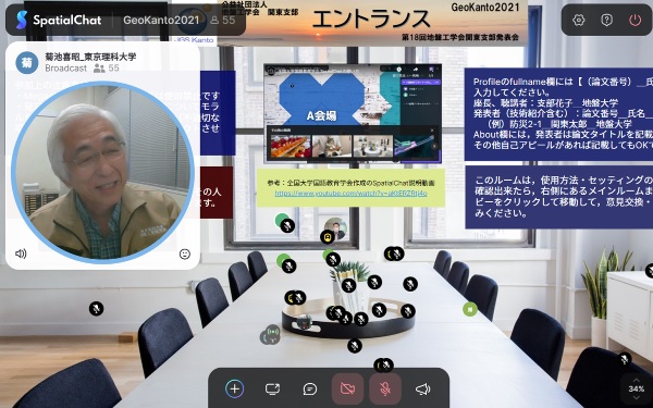 第18回関東支部発表会(GeoKanto2021)が、令和 3 年 10 月 22 日(金)に開催されました。昨年度から続くコロナ禍の状況において、「交流の機会を提供すること」を目標とし、オンライン開催での準備を進めました。意見交換会や交流会をZoomより会話しやすいSpatial Chatを用いて開催し、対面時にロビーで会話するイメージや立食パーティー感覚で交流が図れるようにしました。コロナ禍における新しい交流の場を提供できたと考えております。 |