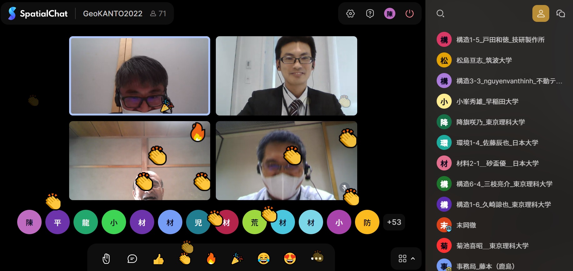 第19 回関東支部発表会(GeoKanto2022)が、令和 4 年 11 月 24 日(木),25日(金)に開催されました。コロナ禍における不確実な情勢においても、「交流の機会を確実に提供すること」を目標として、オンライン開催での準備を進めました。 |